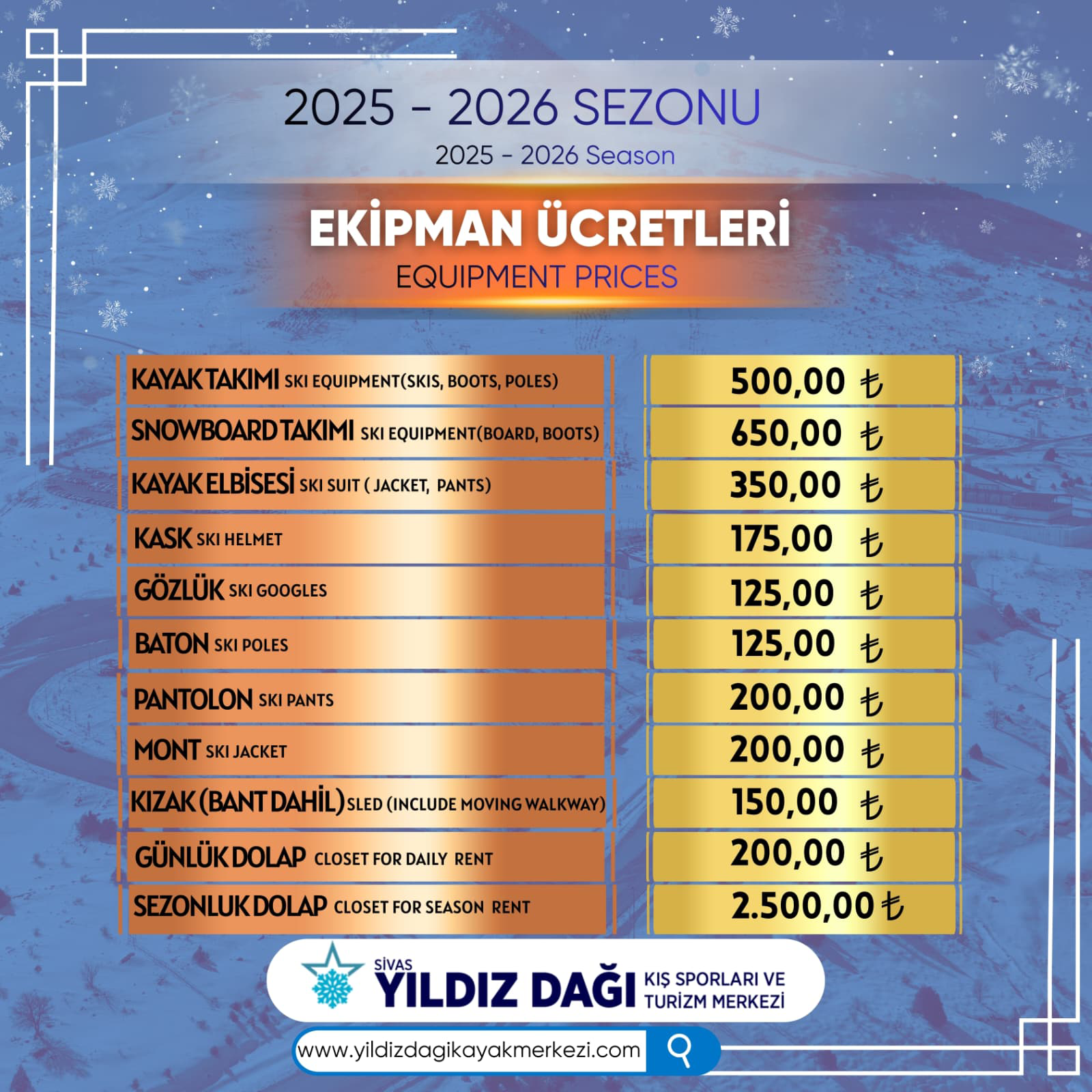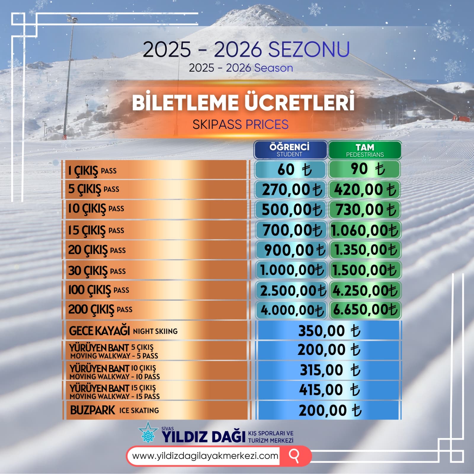 Biletler tesislerin halkın kullanımına açık olduğu günlerde sadece Yıldız Dağı Kayak Merkezi'ne ait olan tesislerde geçerlidir.
